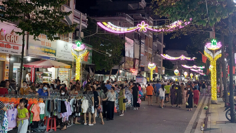 Chợ đêm Móng Cái (Phố đi bộ Trần Phú): Hoạt động vào buổi tối, chuyên bán đồ lưu niệm, quần áo, giày dép và ẩm thực đường phố, không khí rất náo nhiệt.